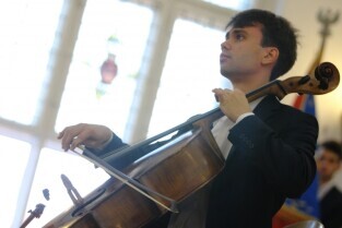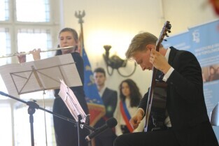 Gdańsk III LO. Wręczenie dyplomów z rąk Wiceprezydenta Gdańska Piotra Kowalczuka beneficjentom programu stypendialnego im. Fahrenheita. Nz Wiolonczelista Bartosz Kaczmarski.