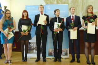 Gdańsk III LO. Wręczenie dyplomów z rąk Wiceprezydenta Gdańska Piotra Kowalczuka beneficjentom programu stypendialnego im. Fahrenheita. Nz Prof. Maria Mendel-Uniwersytet Gdański