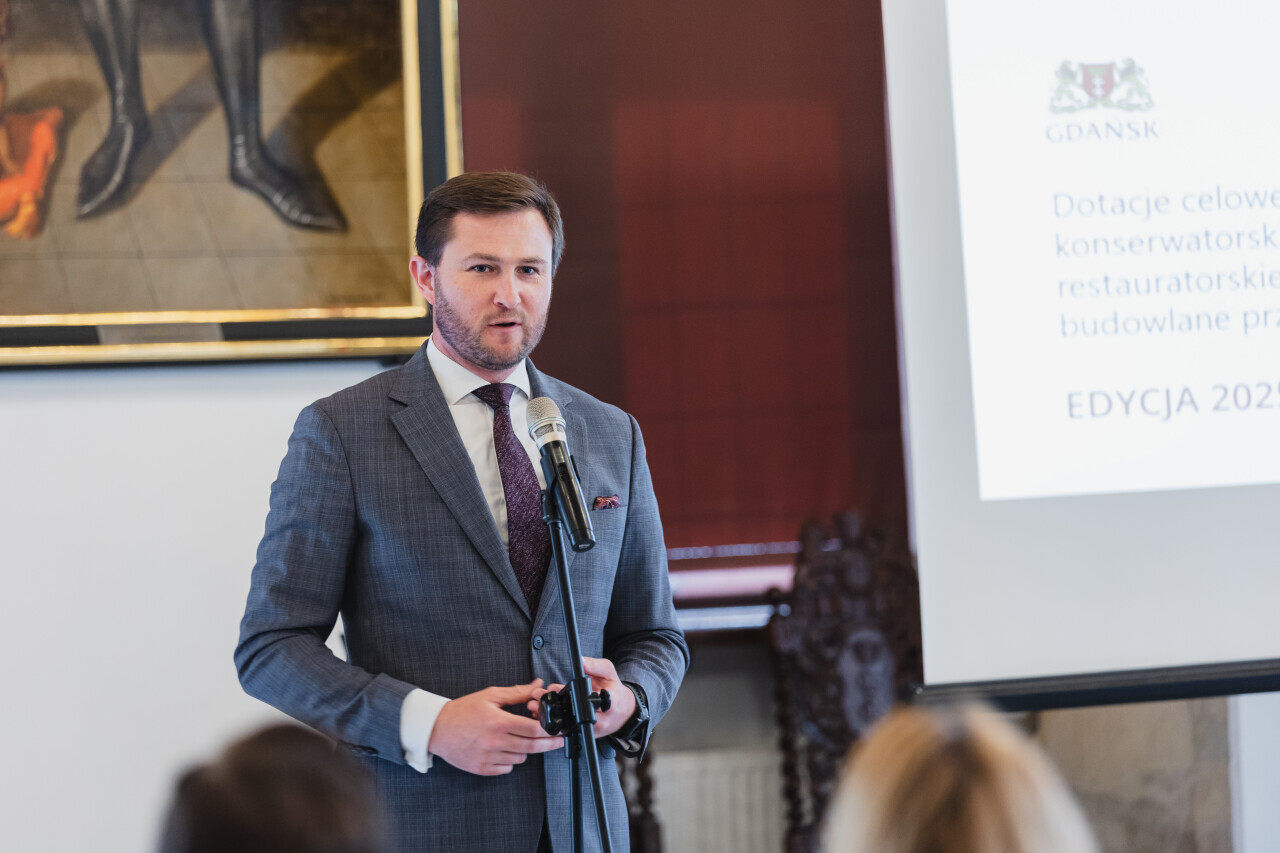 Gdańsk, Wielka Sala Wety. Wręczenie dotacji na ratowanie zabytków. W spotkaniu wzięli udział, Aleksandra Dulkiewicz – Prezydent Miasta Gdańska, Piotr Grzelak – Zastępca Prezydenta ds. zrównoważonego rozwoju, Anna Golędzinowska – Radna Miasta Gdańska, Krystyna Czerniewska – Radna Miasta Gdańska, Maximilian Kieturakis – Radny Miasta Gdańska, przewodniczący Komisji Kultury, członek komisji oceniającej wnioski