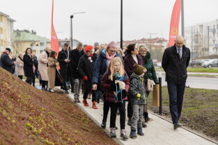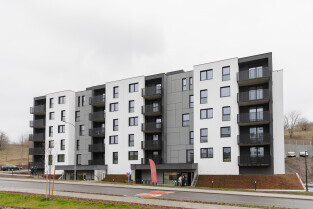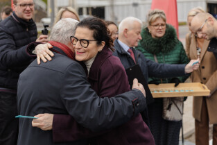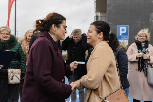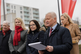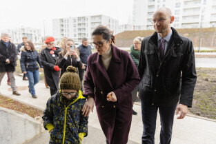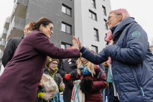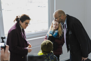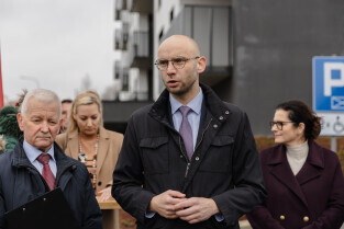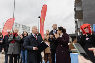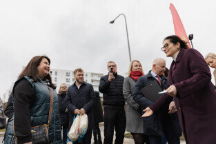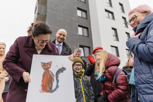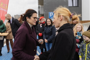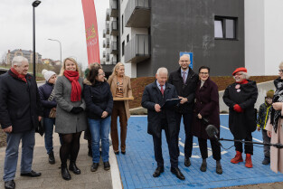 Gdańsk. Wręczenie kluczy do mieszkań przy ulicy Człuchowskiej. W wydarzeniu brali udział Aleksandra Dulkiewicz, prezydent Gdańska, Piotr Kryszewski, zastępca prezydenta ds. usług komunalnych oraz Tadeusz Mękal, prezes zarządu TBS Motława.