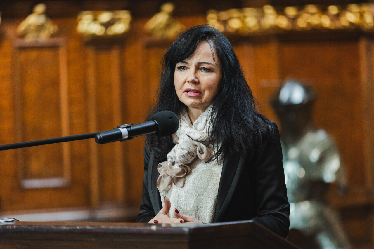 Gdańsk, Dwór Artusa. Wręczenie nagród „Złotej Malwy” 2025. Nz. radna Żaneta Geryk