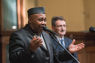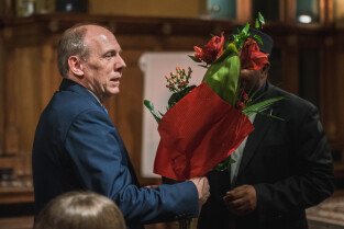Gdańsk, ul. Korzenna. Wręczenie portretu laureata nagrody naukowej im. Jana Heweliusza. Nz. Larry Okey Ugwu-Dyrektor NCK