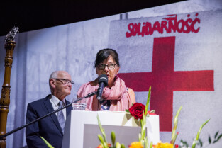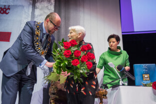 Gdańsk, ECS. Podczas uroczystej sesji Rady Miasta Gdańska wręczono tytułu Honorowego Obywatela Miasta Gdańska Pani prof. Joannie Muszkowskiej-Penson. Nz. Bożena Rybicka-Grzywaczewska