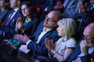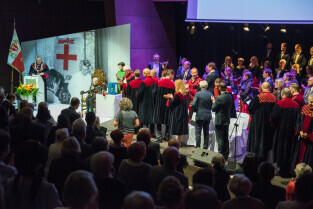 Gdańsk, ECS. Podczas uroczystej sesji Rady Miasta Gdańska wręczono tytułu Honorowego Obywatela Miasta Gdańska Pani prof. Joannie Muszkowskiej-Penson. Nz. Jacek Taylor