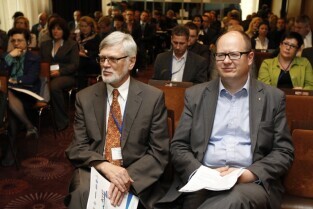 Konferencja "Współpraca partnerska narzędziem aktywnego obywatelstwa". Debata na temat kształtu programu "Europa dla Obywateli". Gdańsk, Hotel Mercure. Nz. od lewej: Przewodniczący Rady Miasta Gdyni dr Stanisław Szwabski i Prezydent Gdańska Paweł Adamowicz