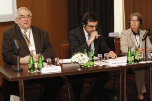 Konferencja "Współpraca partnerska narzędziem aktywnego obywatelstwa". Debata na temat kształtu programu "Europa dla Obywateli". Gdańsk, Hotel Mercure. Nz. od lewej: Dyrektor Biura Związku Miast Polskich Andrzej Porawski, Dyrektor Departamentu ds. Współpracy Bliźniaczej Francuskiej Sekcji Rady Gmin i Regionów Europy Philippe Tarrison, Janine Christienne