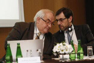 Konferencja "Współpraca partnerska narzędziem aktywnego obywatelstwa". Debata na temat kształtu programu "Europa dla Obywateli". Gdańsk, Hotel Mercure. Nz. Dyrektor Biura Związku Miast Polskich Andrzej Porawski i Dyrektor Departamentu ds. Współpracy Bliźniaczej Francuskiej Sekcji Rady Gmin i Regionów Europy Philippe Tarrison