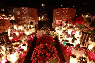 Gdańsk. Wszystkich Świętych, Gdańskie cmentarze po zmierzchu. Nz. Cmentarz Garnizonowy, groby: Feliksa Selmanowicza "Zagańczyka" i Danuty Siedzikówny "Inki".