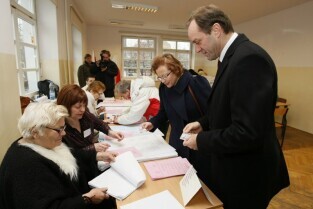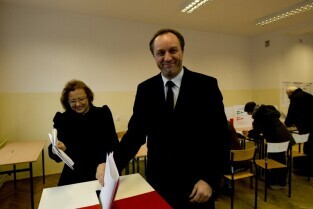 Wybory Samorządowe 2010. Lokal wyborczy w Zespole Szkół Łączności przy ul. Podwale Staromiejskie. Nz. Głosuje Prezydent Gdańska Paweł Adamowicz wraz z żoną Magdaleną, którzy na wybory wybrali się z córkami: Antoniną i Teresą