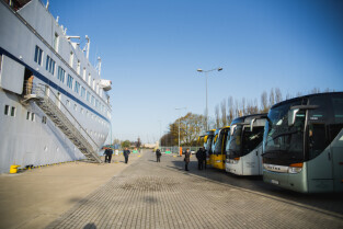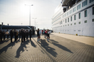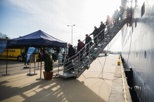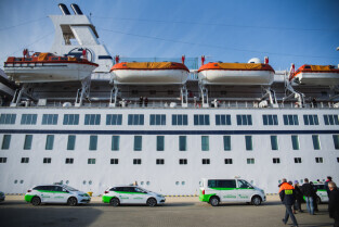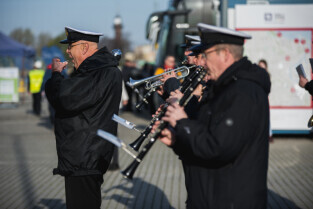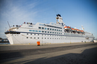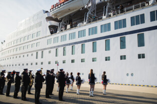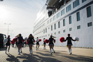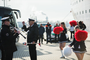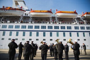Gdańsk. Nabrzeże Obrońców Westerplatte. Wycieczkowiec Astor powitany orkiestrą