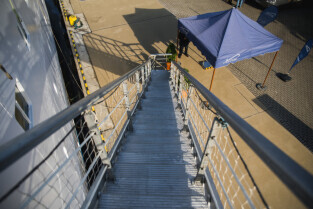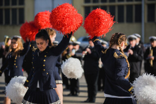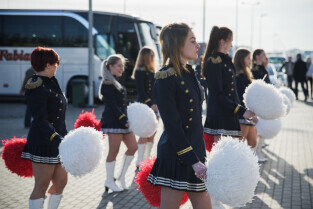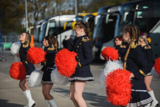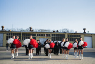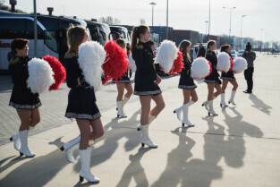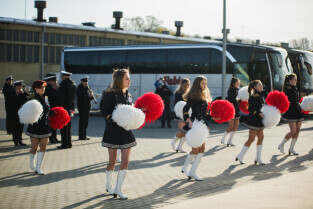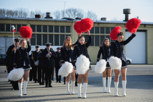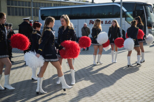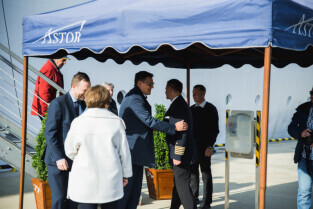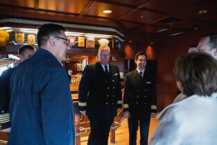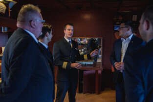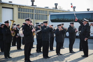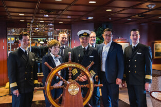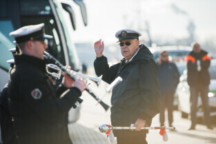 Gdańsk. Nabrzeże Obrońców Westerplatte. Wycieczkowiec Astor powitany orkiestrą. Nz. Bożena Jankowska w-ce prezes zarządu ZMPG; Łukasz Greinke prezes zarządu ZMPG (drugi od prawej); pierwszy od lewej w II rzędzie: Marcin Osowski dyrektor ds. infrastruktury ZMPG