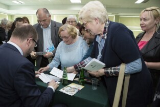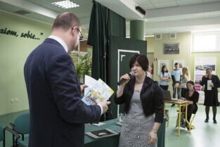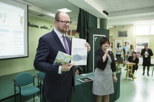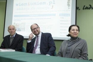 Gdańsk Osowa, ZSO nr 2. Wykład Prezydenta Gdańska Pawła Adamowicza pt. "Gdańsk jako wyzwanie" dla seniorów, słuchaczy Gdańskiej Akademii Dojrzałości. Nz. od lewej: Przewodniczący Zarządu Dzielnicy Osowa Maciej Przybylski, Prezydent Gdańska Paweł Adamowicz, Radna Miasta Gdańska Małgorzata Chmiel