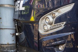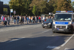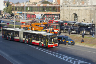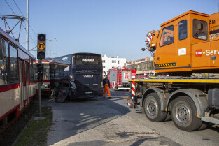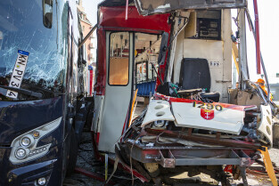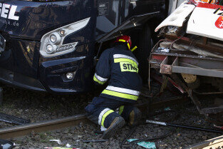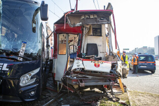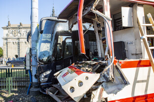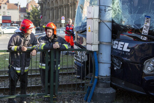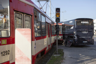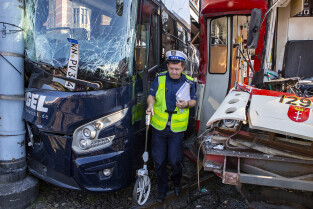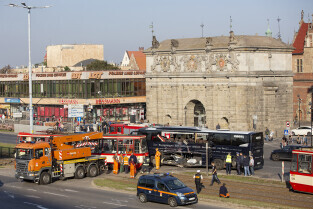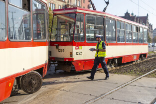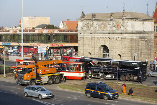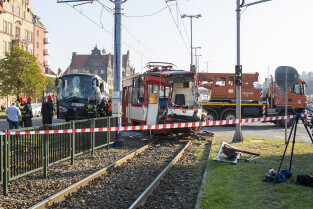 Gdańsk, okolice Bramy Wyżynnej. Wypadek tramwaju i niemieckiego autokaru, w którym poszkodowanych zostało kilkanaście osób w tym motorniczy