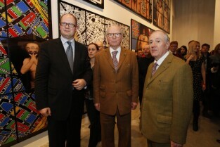 Wernisaż wystawy Gilbert & George - Jack Freak Pictures autorstwa. Gdańsk, Centrum Sztuki Współczesnej "Łaźnia". Nz. autorzy prac George Passmore i Gilbert Prousch (po prawej) z Prezydentem Gdańska Pawłem Adamowiczem