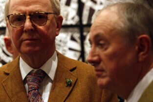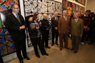 Wernisaż wystawy Gilbert & George - Jack Freak Pictures autorstwa. Gdańsk, Centrum Sztuki Współczesnej "Łaźnia". Nz. autorzy prac George Passmore i Gilbert Prousch (po prawej), od lewej: Prezydent Gdańska Paweł Adamowicz i Dyrektor "Łaźni" Jadwiga Charzyńska
