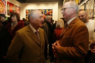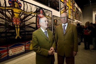 Wernisaż wystawy Gilbert & George - Jack Freak Pictures autorstwa. Gdańsk, Centrum Sztuki Współczesnej "Łaźnia". Nz. autorzy prac George Passmore i Gilbert Prousch (po prawej)