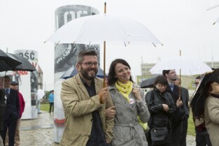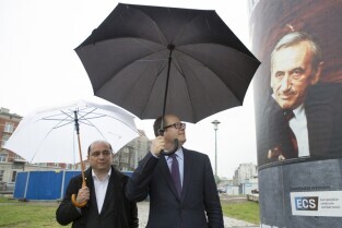 Wernisaż wystawy plenerowej "Czasy przełomu" w 25. rocznicę pierwszych, częściowo wolnych wyborów. Gdańsk, plac Solidarności. Nz. od lewej: Dyrektor Europejskiego Centrum Solidarności Basil Kerski i Prezydent Gdańska Paweł Adamowicz