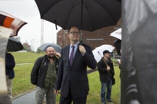 Wernisaż wystawy plenerowej "Czasy przełomu" w 25. rocznicę pierwszych, częściowo wolnych wyborów. Gdańsk, plac Solidarności. Nz. Prezydent Gdańska Paweł Adamowicz