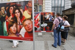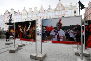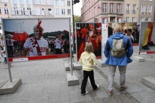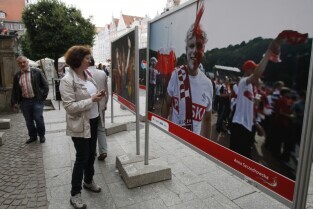 Gdańsk, Długi Targ. Wystawa fotograficzna "Mój Gdańsk, moje Euro", prezentująca kibiców w Gdańsku podczas piłkarskich mistrzostw Europy. Na wystawę składają się fotografie nadesłane na konkurs zorganizowany przez Biuro Prezydenta ds. Promocji Miasta oraz wykonane przez trójmiejskich fotoreporterów.