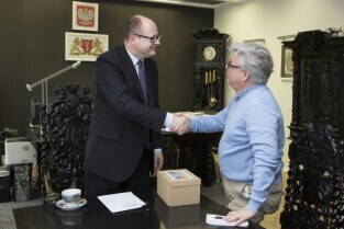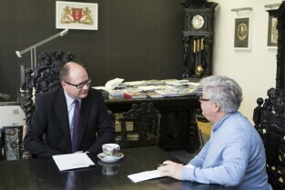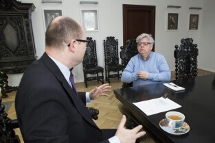 Urząd Miejski w Gdańsku. Kierownik biura The New York Times w Warszawie Rick Lyman przeprowadza wywiad z Prezydentem Gdańska Pawłem Adamowiczem