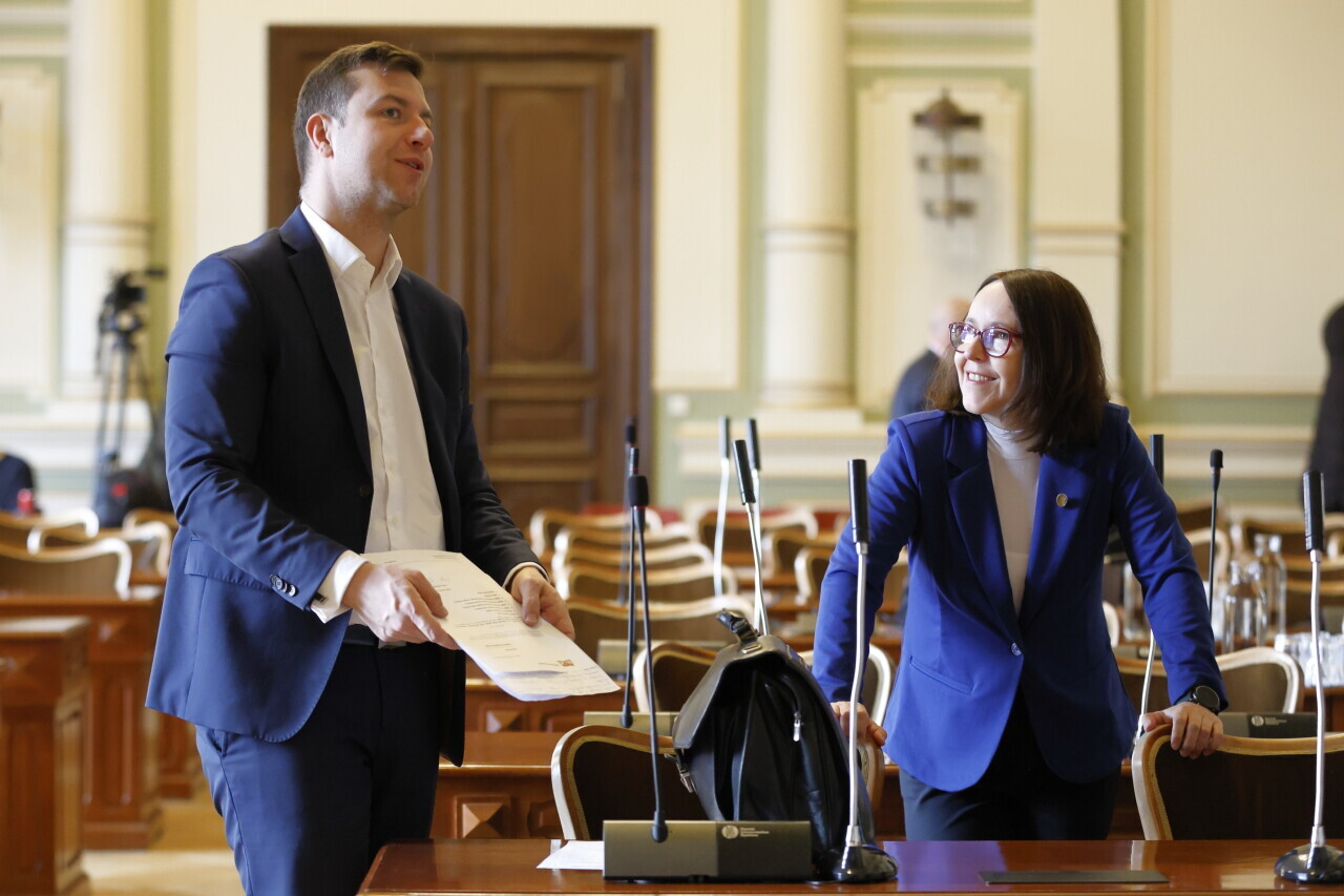 Gdańsk. XIII Sesja Rady Miasta Gdańska. Nz. Radni Cezary Śpiewak-Dowbór i Kamila Błaszczyk.