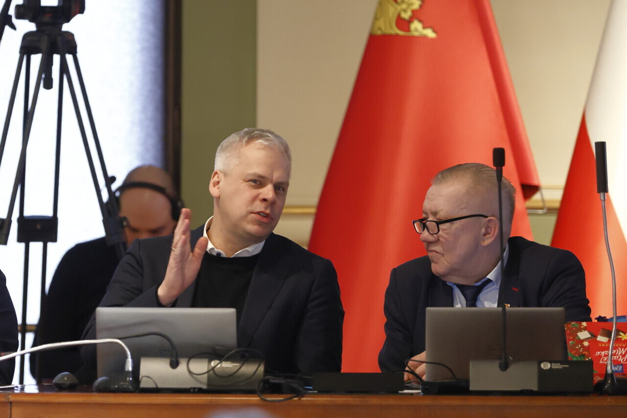 Gdańsk. XIII Sesja Rady Miasta Gdańska. Nz. Wiceprzewodniczący Rady Miasta Gdańska Karol Rabenda i Piotr Dzik.