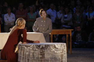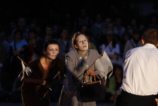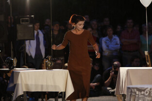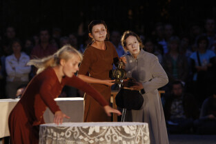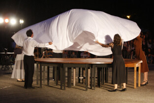 Przedstawienie "Stół" Teatr Snów (Gdańsk) na boisku pomiędzy Długim Targiem, a ul. Ogarną