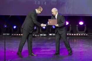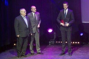 XII Gdańska Gala Sportu. Złota „10” Gdańskiego Sportu. I miejsce: Mateusz Mika. Nagrodę wręczają Prezydent Gdańska Paweł Adamowicz i Przewodniczący Rady Miasta Gdańska Bogdan Oleszek. Gdańsk, Teatr Szekspirowski