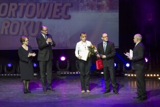 XII Gdańska Gala Sportu. Złota „10” Gdańskiego Sportu. II miejsce: Piotr Myszka. Nagrodę odbiera żona Zuzanna Myszka. Gdańsk, Teatr Szekspirowski