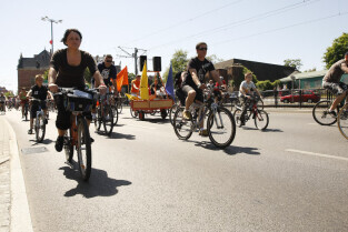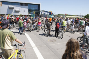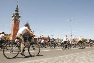 XII Przejazd Rowerowy 2008. Nz. rowerzyści wjeżdżają na teren campusu Uniwersytetu Gdańskiego