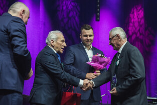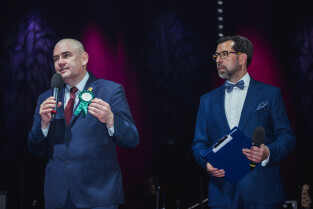 Gdańsk. Amber Expo. XIV Miejski Bal Seniora. W trakcie balu przyznano nagrody i wyróżnienia od Prezydenta Gdańska dla Aktywnych Seniorów. Nz. Wiceprezydent Gdańska Piotr Kowalczuk i Andrzej Stawicki