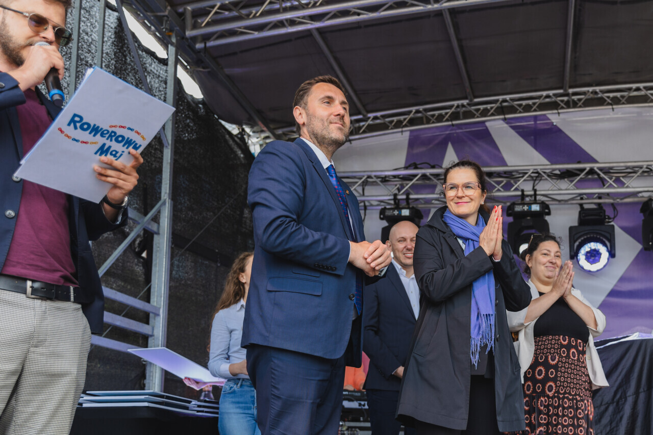 Gdańsk, Targ Węglowy. XI edycja Rowerowego Maja. Piknik oraz wręczenie nagród. Dyplomy wręczali, Aleksandra Dulkiewicz, prezydent Gdańska, wiceprezydent Piotr Borawski i Marcin Bonisławski