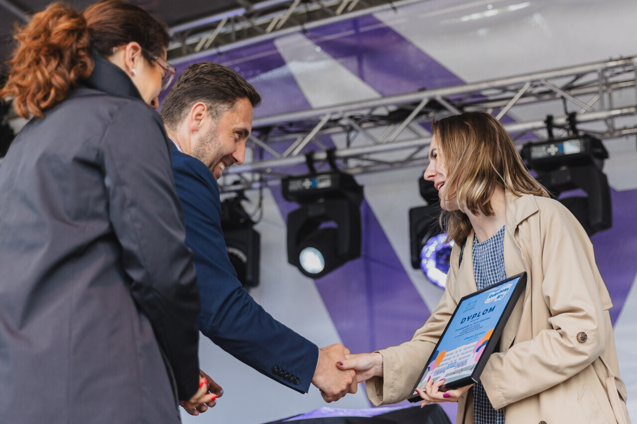 Gdańsk, Targ Węglowy. XI edycja Rowerowego Maja. Piknik oraz wręczenie nagród. Dyplomy wręczali, Aleksandra Dulkiewicz, prezydent Gdańska, wiceprezydent Piotr Borawski i Marcin Bonisławski