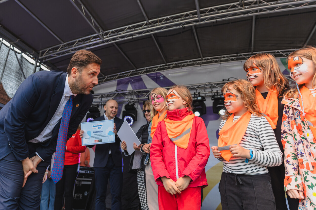 Gdańsk, Targ Węglowy. XI edycja Rowerowego Maja. Piknik oraz wręczenie nagród. Dyplomy wręczali, Aleksandra Dulkiewicz, prezydent Gdańska, wiceprezydent Piotr Borawski i Marcin Bonisławski