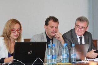 Urząd Miejski w Gdańsku. Sierpniowa sesja Rady Miasta Gdańska. Nz. (od prawej) Przewodniczący Rady Bogdan Oleszek oraz Wiceprzewodniczący Jarosław Gorecki i Agnieszka Owczarczak.