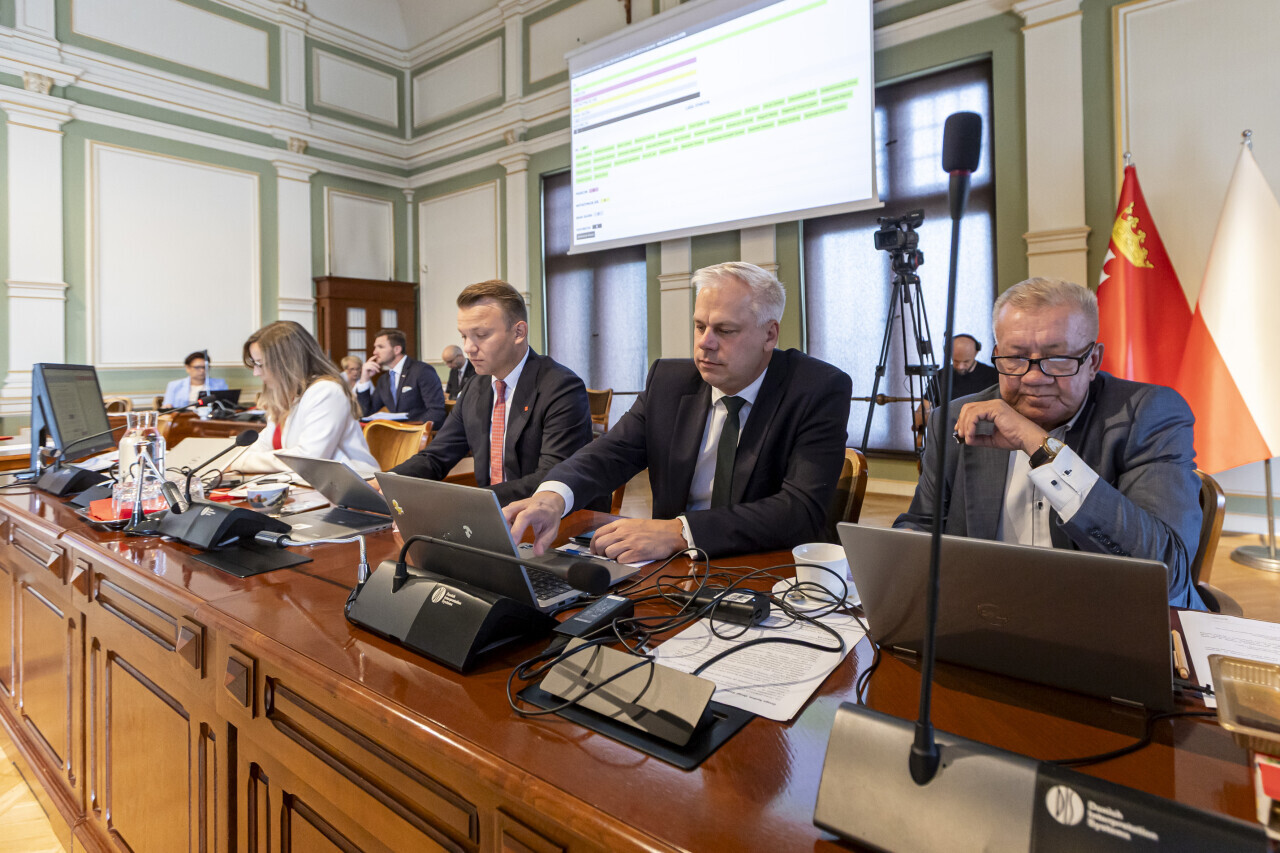 Gdańsk. XVIII Sesja Rady Miasta. Nz. Wiceprzewodniczący Rady Miasta Mateusz Skarbek, Karol Rabenda i Piotr Dzik