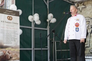 XVI Święto Chleba. Festyn rzemiosła piekarskiego, degustacje. Gdańsk, Długi Targ. Nz. Leszek Meler (Stowarzyszenie Rzemieśliników Piekarstwa RP)