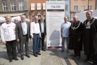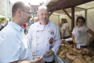 XVI Święto Chleba. Festyn rzemiosła piekarskiego, degustacje. Gdańsk, Długi Targ. Nz. od lewej: Z-ca Prezydenta Gdańska Maciej Lisicki i Leszek Meler (Stowarzyszenie Rzemieśliników Piekarstwa RP)