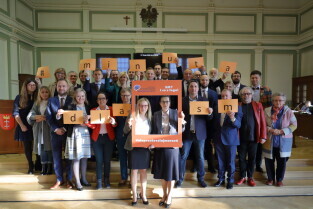 Gdańsk. XV sesja Rady Miasta Gdańska. Wspólna fotografia w ramach akcji wspierającej chorych na stwardnienie rozsiane - "Minuta dla SM".