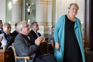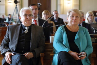 Gdańsk. XV sesja Rady Miasta Gdańska. Nz. Edmund Wittbrodt prezes Zrzeszenia Kaszubsko-PomorskiegoSławina Kosmulska, córka Lecha Bądkowskiego.