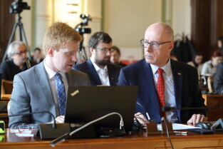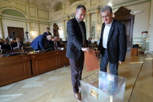 Gdańsk. XV sesja Rady Miasta Gdańska. Nz. Radni: Przemysław Malak i Andrzej Stelmasiewicz.