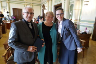 Gdańsk. XV sesja Rady Miasta Gdańska. Nz. Edmund Wittbrodt prezes Zrzeszenia Kaszubsko-Pomorskiego, Sławina Kosmulska, córka Lecha Bądkowskiego i Prezydent Gdańska Aleksandra Dulkiewicz.