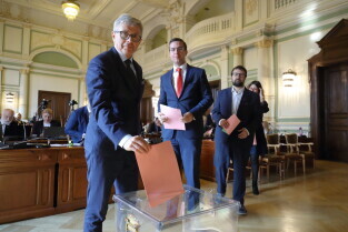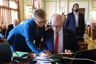 Gdańsk. XV sesja Rady Miasta Gdańska. Nz. Radni: Elżbieta Strzelczyk, Kazimierz Koralewski i Przemysław Malak.