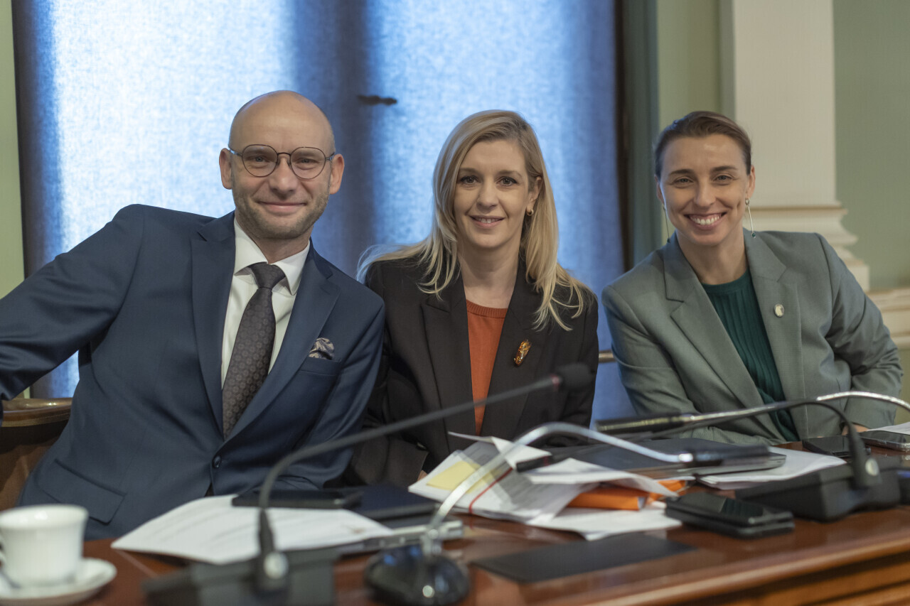 Gdańsk. XXI sesja Rady Miasta Gdańska. Nz. Dyrektor Zarządzający ds. Zielonego Gdańska Piotr Kryszewski, Wiceprezydentki Gdańska Emiliua Lodzińska i Monika Chabior.