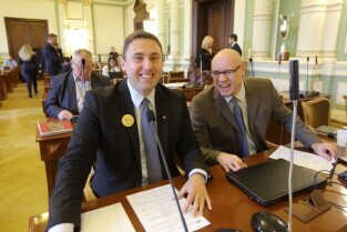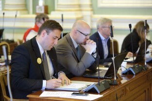 Gdańsk. XXXVII posiedzenie Rady Miasta Gdańska. Nz. Piotr Borawski i Wojciech Stybor.