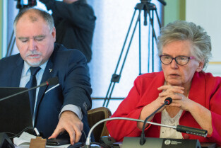 Gdańsk, Nowy Ratusz ul Wały Jagiellońskie. XX sesja Rady Miasta Gdańska. Nz. Teresa Wasilewska i Piotr Gierszewski