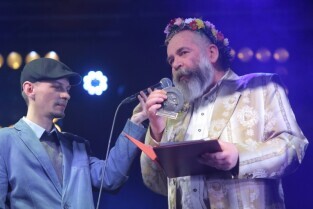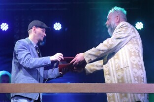 24 Festiwal Polskich Wideoklipów YACH FILM 2015. Nz Paulus Mazur wręczył Yachowi Paszkiewiczowi Nagrodę im. Nikosa Chadzinikolau, przyznaną reżyserowi podczas Międzynarodowego Listopada Poetyckiego w Poznaniu, organizowanego przez Związek Literatów Polskich Oddział w Poznaniu.