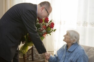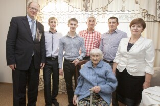 Prezydent Gdańska Paweł Adamowicz z wizytą u Państwa Łazarew - rodziny repatriancką z Kazachstanu, która zamieszkała w Gdańsku na zaproszenie władz miasta. Gdańsk Zakoniczyn