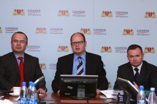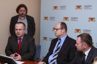 Urząd Miejski w Gdańsku. Podpisanie umowy na dofinansowanie projektu "Kompleksowe zabezpieczenie przeciwpowodziowe Żuław - etap I - Gdańsk". Nz. (od lewej) zastępca Prezesa Zarządu NFOśiGW Jan Majka, Prezydent Gdańska Paweł Adamowicz i Prezydent Elbląga Grzegorz Nowaczyk.