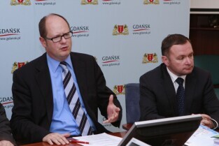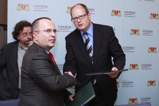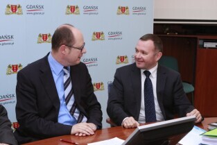 Urząd Miejski w Gdańsku. Podpisanie umowy na dofinansowanie projektu "Kompleksowe zabezpieczenie przeciwpowodziowe Żuław - etap I - Gdańsk". Nz. (od lewej) Prezydent Gdańska Paweł Adamowicz i Prezydent Elbląga Grzegorz Nowaczyk.